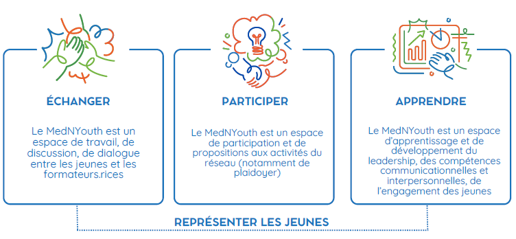 MedNYouth est un espace d'échange et de possibles pour les jeunes. Les représentant·e·s y portent la voix de leurs pairs en étant ambassadeurs dans leurs écoles ou dispositifs d’insertion. En 2024, une consultation de grande ampleur a été menée auprès de 230 jeunes pour faire remonter les priorités des jeunes méditerranéens. Trois enjeux ont été identifiés : 1-Briser les stéréotypes, 2- L'importance du numérique, et 3- Les difficultés d'intégration des jeunes sur le marché du travail.