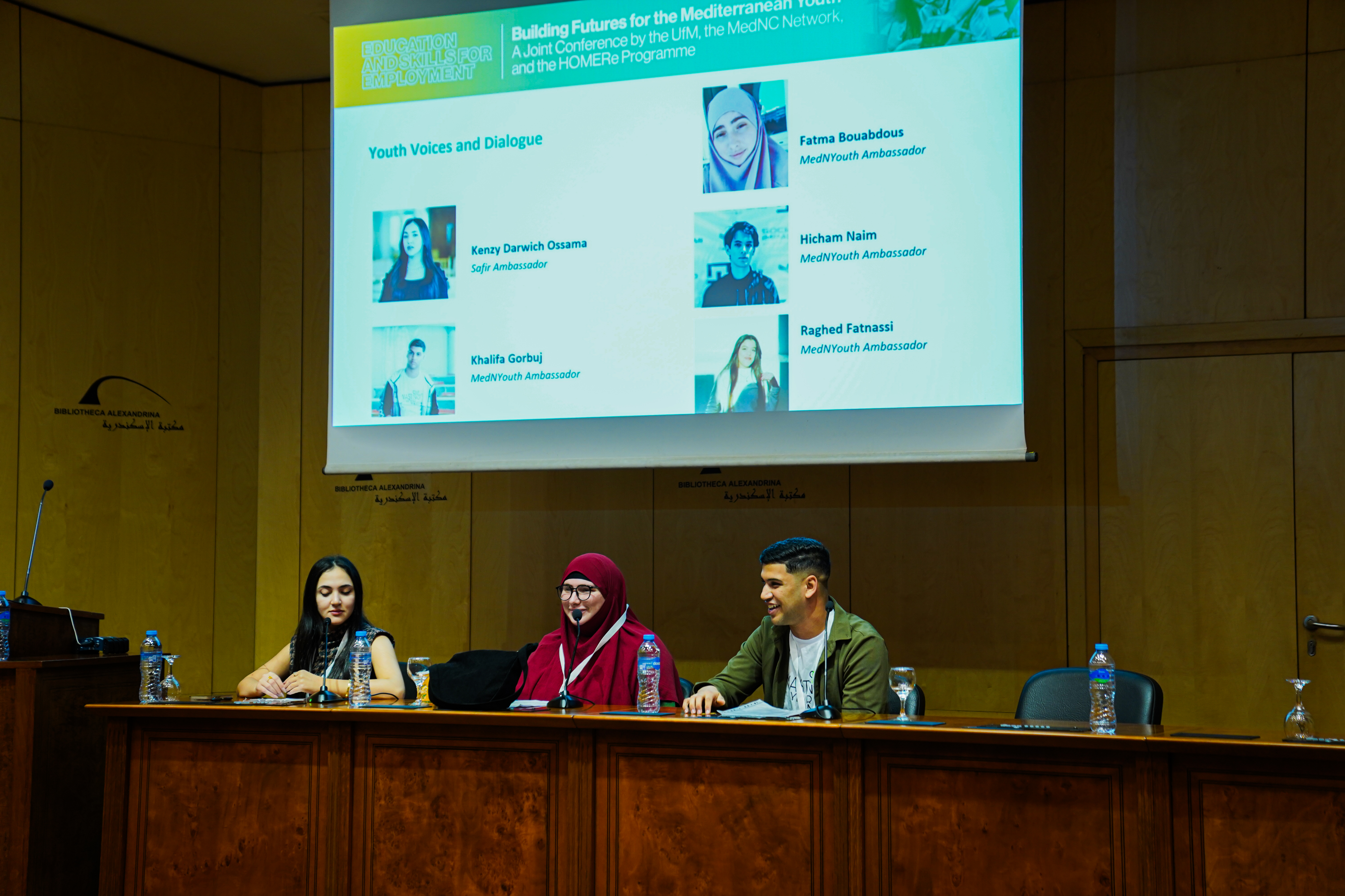 Session "La voix des Jeunes : le MedNYouth" avec Kenzy Darwich (Safir project), Khalifa Gorbuj (Rafiq E2C / MednYouth), et Fatma Boudabbous (E2C Marseille/MedNYouth)